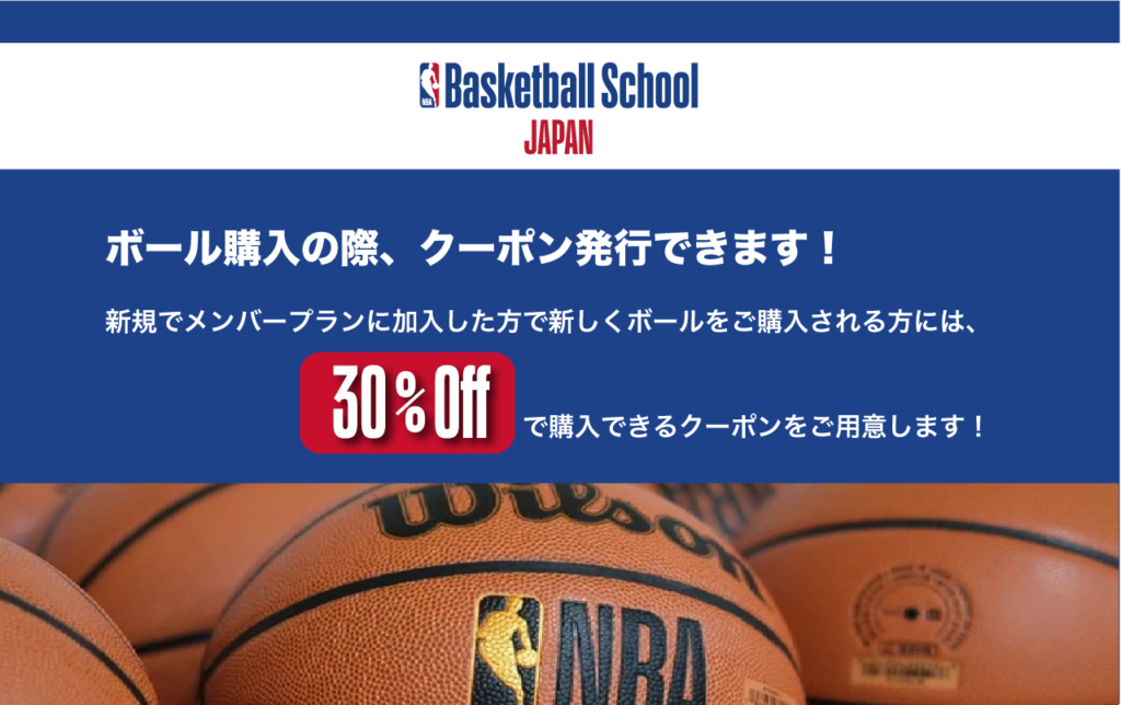スクールやクリニック、各種イベント参加の際には、NBA Basketball School公式が指定するWilson製のバスケットボールをご使用いただきます。ウィルソン製のボールをお持ちでなく購入が必要な方には、会員特典として30%OFFで購入できるクーポンを配布しています。(入会手続き後配布)
